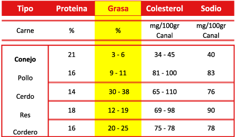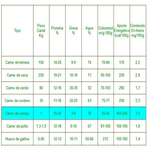 Tabla comparativa de propiedades nutricionales de la carne de conejo y otras carnes